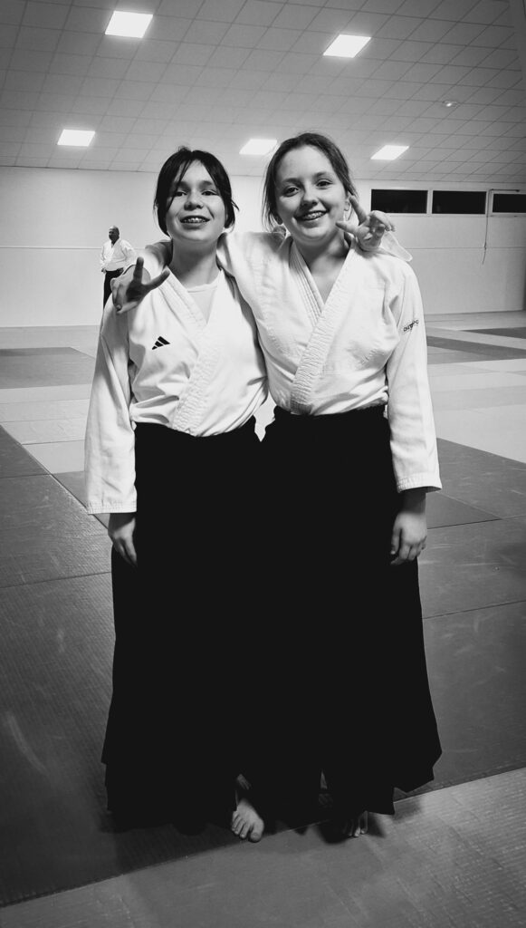 Nous avons également eu le plaisir de remettre leurs ceintures bleues et hakama à Maya DUGRILLON et Apolline BOUSSARD, toutes deux issues de notre section enfants/ados. Une étape importante qui marque leur progression et leur engagement dans la pratique de l’aïkido.